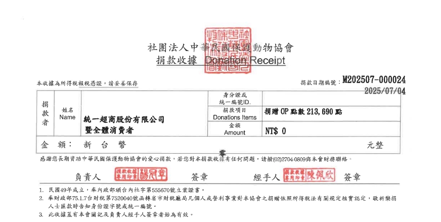 2025/04/01-2025/06/30期間,社團法人中華民國保護動物協會獲贈213,690點(元)。