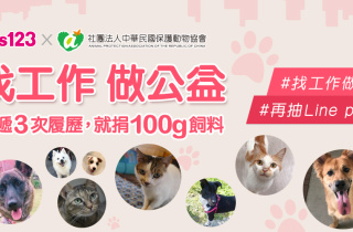 新年度新氣象,yes123求職網與協會合作,12月即日起至1月中旬,只要到yes123投履歷,就捐贈飼料給協會的浪浪,還可參加抽獎,獎...