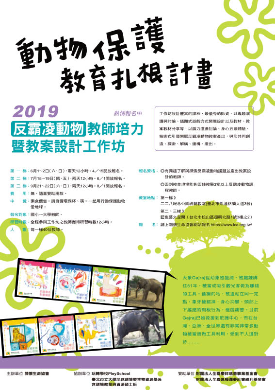 為了提升民眾對於「反霸凌動物」議題的觀念 ,關懷生命協會與玩轉學校PleySchool及臺北市立大學地球環境暨生物資源學系含環境教育與資源碩士班合作,舉辦「2019反霸凌動物教師培力暨教案設計工作坊」研習共三梯次,感謝財團法人全聯慶祥慈善事業基金會及財團法人全聯佩樺圓夢社會福利基金會的熱情贊助。第一梯次已於2019年6月1~2日圓滿結束,將於7月18日~19日(四、五)、9月21~22日(六、日)於台北舉辦第二、三梯次課程,歡迎全台教師免費報名參加!