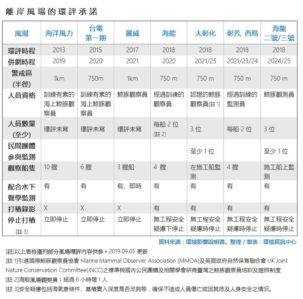 李恩娜指出,這份手冊明確列出MMO該如何行使其任務,也規範廠商該如何劃設警戒區、配置人員,甚至對不同保護標的,例如深水型還是淺水型的鯨豚,也有個別的規範。遊戲規則清楚,廠商也有依循的標準。台灣在環評階段還沒有統一的鯨豚觀察規劃準則(至今也仍未有),因此離岸風場只好各自設計執行方案[3]。