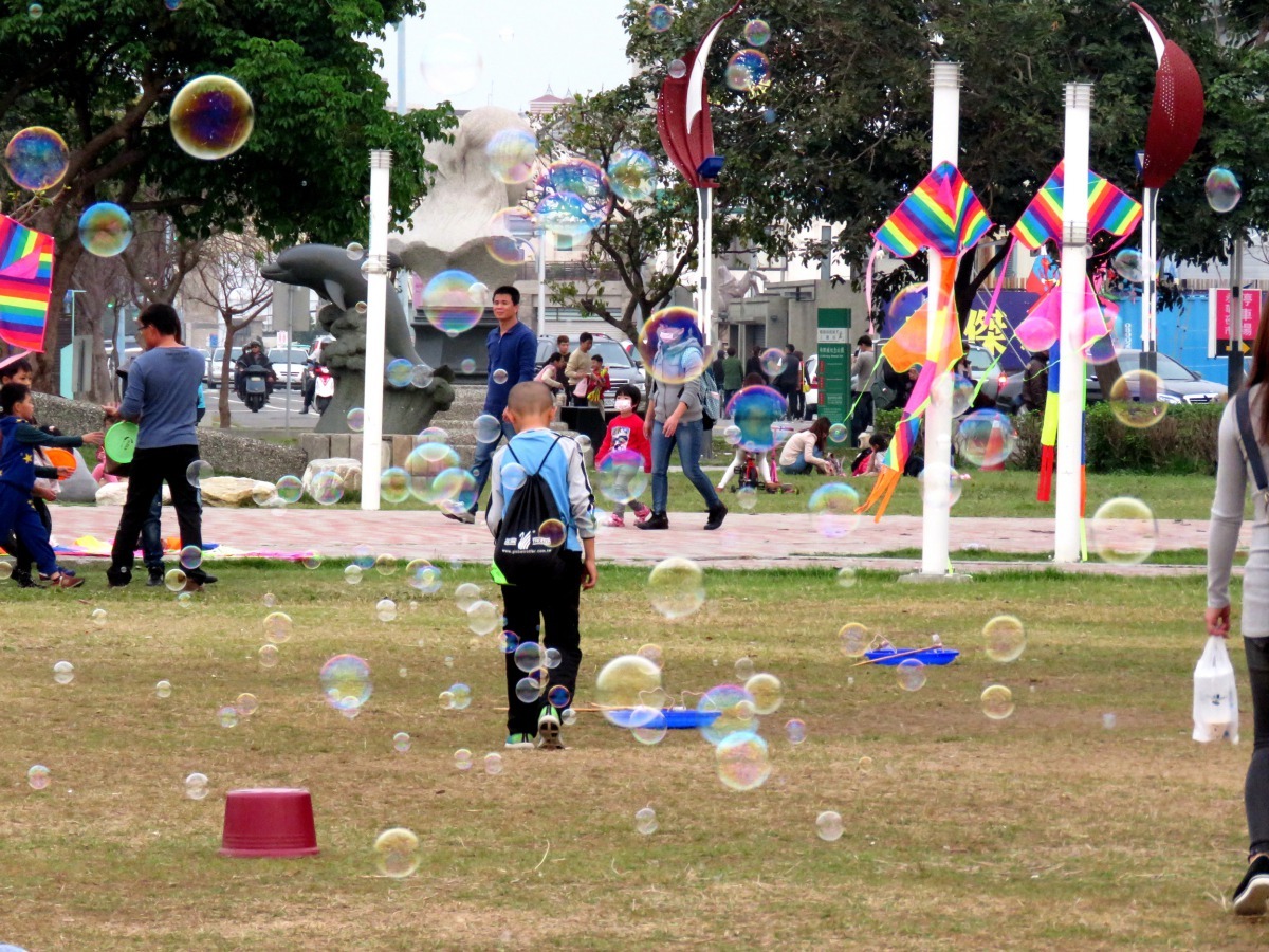 該公園位於海邊風勢強,讓賣風箏及吹泡泡的商販找到商機,當巨大的風箏升空,宛如巨龍般非常壯觀,小朋友想抗拒都很難,家長也利用難得的休假放鬆一下;向攤商買盤泡泡水就會附上吹泡泡棒,沾水後舉高迎逆風方向擺動即會吹起泡泡,玩的人多,整個園區都是泡泡飄浮,非常熱鬧。