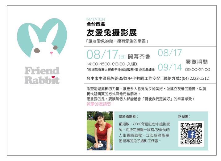 在8月17日的開展茶會上,鄭如敏除了分享展覽的內容外,也會提出將來的計畫,她希望能夠藉由愛兔文創的推動,減少煽情、悲情的文字宣傳,以圖像為主軸,讓人們看見兔子迷人的一面。