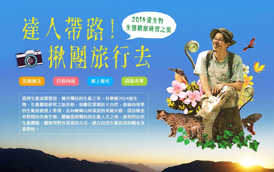 現代人生活在都市之中,與大自然的接觸有限,農委會特生物研究保育中心(特生中心)今年舉辦了結合了生態旅遊與生物多樣性網路建置的「2014愛生物生態觀察研習之旅:達人帶路!揪團旅行去」活動,邀請民眾一同參與生態旅遊與提供生物照片,幫助豐富台灣生物多樣性資料庫。