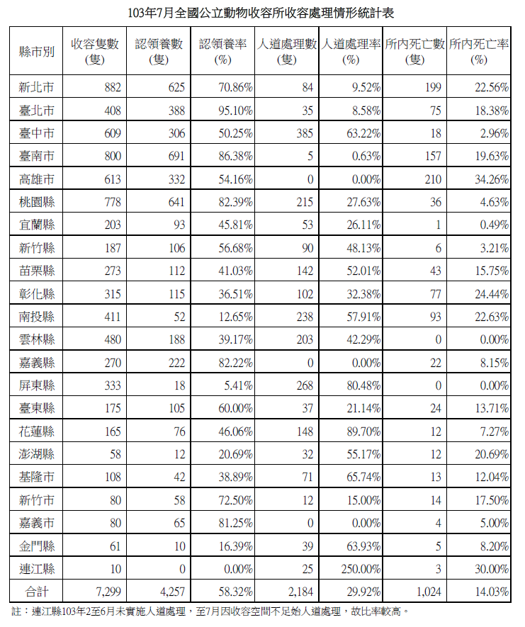 日前「自然死亡率 收容所不能說的秘密?」一文引起大家對收容所自然死亡率的重視。昨(16)天上午,由關懷生命協會召開的「2014動物保護行政評鑑」記者會中,公告了2013年各公立收容所的「所內死亡率 (即自然死亡率)」,而農委會動物保護資訊網,最近也初次公開今年7月的「所內死亡數」、「所內死亡率」資訊!