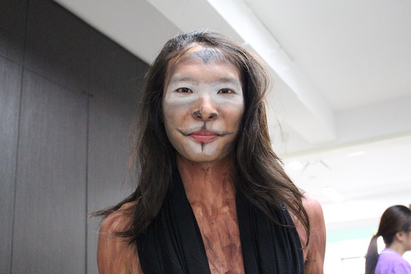 師大動物權利促進陣線社長羅丹在今日抗議現場全身彩繪、打扮成猴樣,將自己關進籠中,羅丹表示,在進入狹窄的牢籠中、黑布被蓋上的那一刻,他覺得相當的徬徨,不知道外界發生了什麼事,而不過在籠子中待了30分鐘,他就已經全身痠痛,更何況是運送時間長達40小時的猴子。