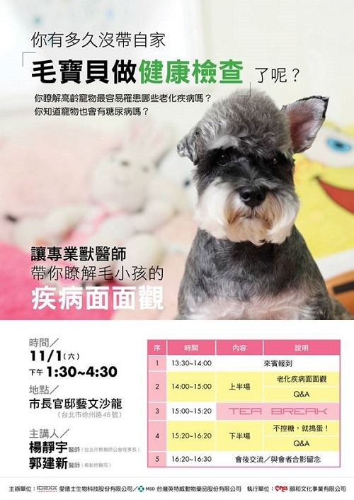 狗狗貓貓對許多家庭來說,早已跟家人一樣重要,隨著動物醫療的進步與發展,同伴動物也有了「高齡化」的趨勢,狗奶奶貓爺爺越來越多,所以飼主對於如何照護高齡寵物的知識需求也強烈增加,而糖尿病這個慢性殺手更是中老年疾病當中不可忽視的。本場講座分為上、下半場,主題分別是「老化疾病面面觀」與「不控糖,就搗蛋!」。除了分享專業知識,現場也將備有精緻茶點,歡迎飼主一同參與這豐富充實的午後時光。