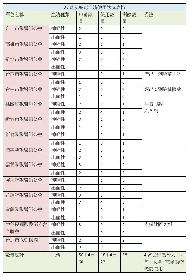今年6月16日在立法委員王育敏的協調下,疾管署終於同意釋出50劑神經性、25劑出血性,總計75劑抗蛇毒血清給獸醫師使用,並且由中華民國獸醫師公會全國聯合會(以下簡稱全聯會)負責管理,直到明年10月新的蛇毒血清生產廠上線之後,才能再洽談是否依今年模式供給一定數量的血清給獸醫師。