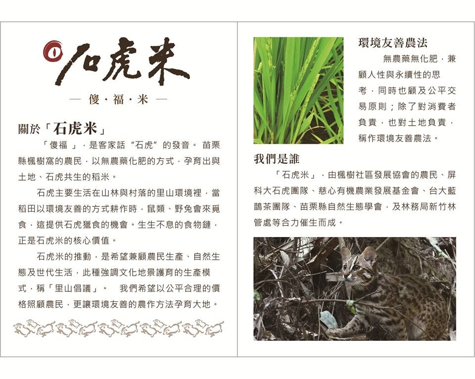 除此之外,由屏科大石虎團隊、楓樹社區發展協會的農民、慈心有機農業發展基金會、台大藍鵲茶團隊、苗栗縣自然生態學會及林務局新竹林管處等合力催生而成的「石虎米」,更象徵跨出了社區與生態共存共榮的第一步。