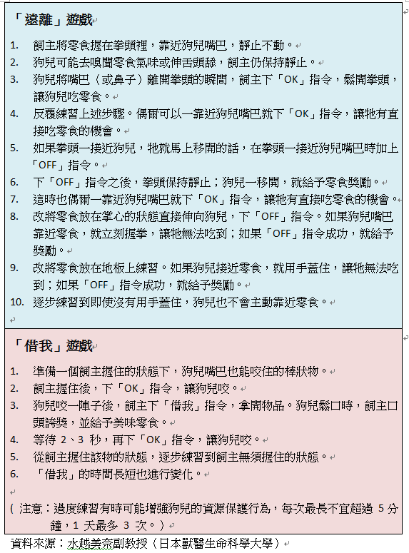 有些飼主在狗兒咬了不該咬的東西時,每次都用零食跟牠交換;然而,這也可能讓狗兒學到:「只要去咬危險物品,主人就會給我吃零食!」因此,這種方法只能當成迫不得已的殺手鐧。平時不妨準備一些適合狗兒啃咬的玩具,狗兒開始玩就好好誇獎。此外,也可以做一些「遠離」或「借我」的獎勵遊戲,狗兒一旦不幸咬到危險物品,才有機會救牠一命。