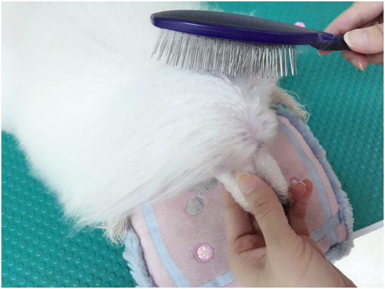 為了讓毛孩兒能輕鬆享受梳毛的過程,建議準備小枕頭,訓練毛孩可以趴著梳毛,並使用毛孩專用的柄梳,操作時注意力道要輕,才不會將柔細的被毛扯斷。
