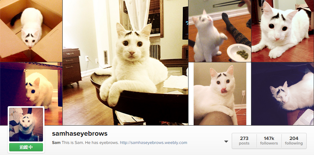 第5名是紐約的當紅炸子貓:山姆有眉毛samhaseyebrows,擁有147k名粉絲的山姆,根據他的官網寫道,山姆來到主人家中的方式相當奇特,既不是被領養、也不是突然出現在後院,而是連著提袋被丟棄在兩棟房子之間。後來害怕山姆受傷索性將牠帶進屋內,並以安迪沃荷(Andy Warhol)的貓Sam命名。