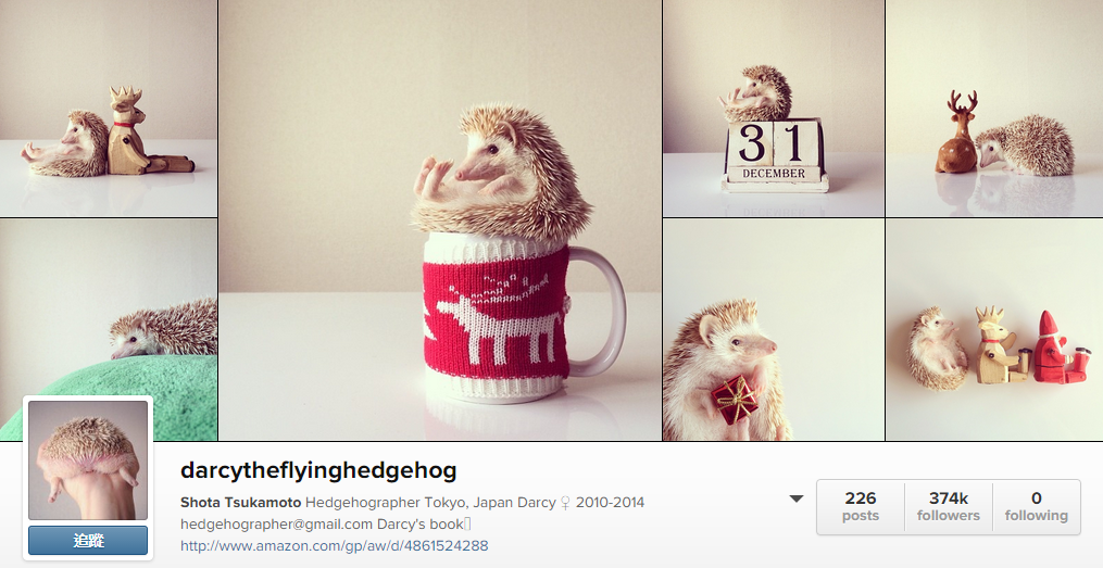 第3名的人氣寵兒跳脫貓狗,竟然是有著尖刺外表的刺蝟寶寶darcytheflyinghedgehog,粉絲高達374k的牠住在東京,主人總是會幫他拍攝清新日系風格的照片,牠甚至還有一本自己的寫真書呢,超療癒的模樣難怪登上2014人氣寵物排行!不過達西Darcy卻在今年2月時過世,飼主在instagram上悼念牠,也謝謝粉絲們一直以來的支持。