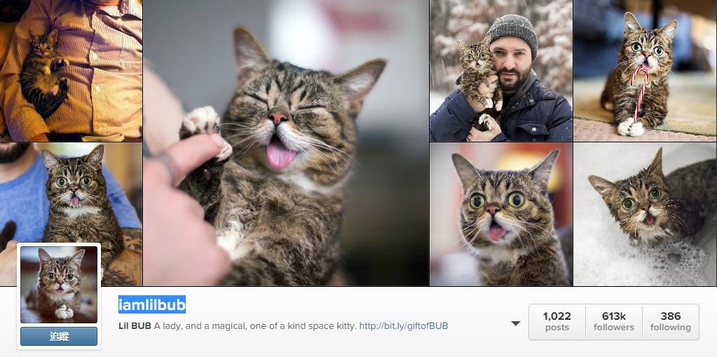 第2名則是613k人追蹤的吐舌貓Lil BUB,照片中總是俏皮半露舌頭的牠,其實是罹患了罕見的骨骼、爪子變形疾病,而且天生沒有牙齒,所以舌頭才總是露出來。不過牠的主人在youtube專屬頻道上寫著,Lil Bub是一隻帶來喜樂的貓咪,因為光是看著他的臉就能讓人心情愉悅。