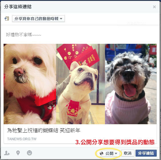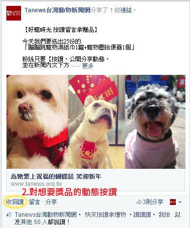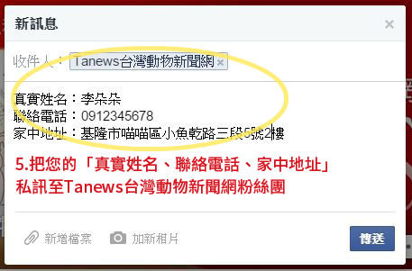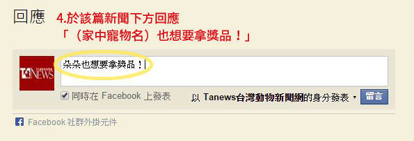 Tanews台灣動物新聞網粉絲專業將會在2/18-2/23每日下午兩點,貼出一篇「好寵時光優選獎作品」動態,只要Tanews台灣動物新聞網的粉絲對該動態貼文「按讚」、「公開分享」,並於新聞文章下方留言「(家中寵物名)也想要拿獎品!」最後再把您的「真實姓名、聯絡電話、家中地址」私訊至粉絲團,即符合獲獎資格。