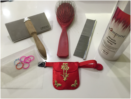- 美容包毛紙、橡皮筋、柄梳:娜子的長毛平日都用美容紙包紮的整整齊齊,但外出時仍有可能會有發生紙張溼掉和橡皮筋斷掉,臨時要找這兩樣東西可不容易,所以我會在出門時帶著以備不時之需。