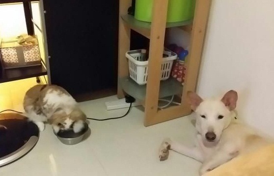 照片左邊是領養者的舊家庭成員─可愛的賓尼兔,很專心很滿足地在開大餐!我們看見照片第一時間都是問:「隻兔仔唔驚隻狗嗎?」「隻狗唔怕隻兔仔嗎?」「隻狗唔會『蝦』兔兔嗎?」又或「兔兔唔會恰狗狗嗎?」答案當然是:唔會!