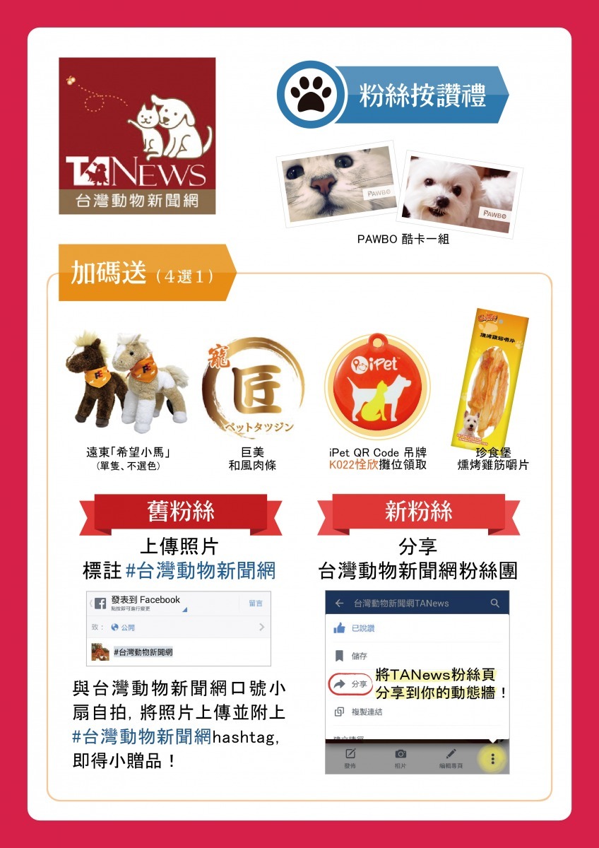 最後,不論正在看文章的你已經是我們的老會員、或是新粉絲,只要在寵物展來到台灣動物新聞網的攤位(K1119),替我們的粉絲團按讚就有「可愛貓狗酷卡一組」,舊會員只要再上傳照片、新粉絲只要分享粉絲團,就可以再享有每日好禮四選一,包含:「遠東百貨希望小馬一隻」、「珍食堡雞筋嚼片一包」、「恮欣QRcode吊牌一個」或「巨美寵物零食肉條一包」!