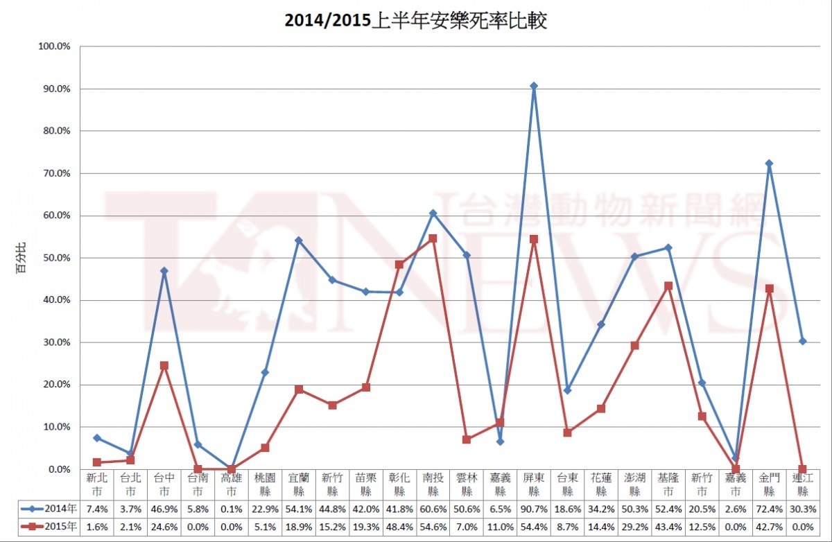 另外,雖然新版動保法兩年後才要執行零安樂,但台南市今年元旦提早上路、新北市於3月份也宣布跟進。但根據資料可以發現,高雄市、嘉義市、連江縣上半年為止也都沒有執行安樂死,苗栗縣則是從4月到6月都沒有安樂。