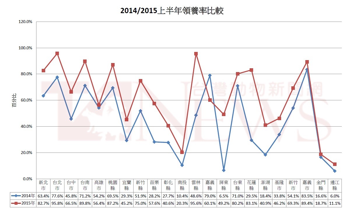 此外,認養率前三名今年由台北市95.77%榮獲第一高,而第二名則是今年的「黑馬」雲林縣,第三名和第四名則不分軒輊由台南市、嘉義市拿下。在認養率的部分,需要努力的縣市則為:南投縣、彰化縣。