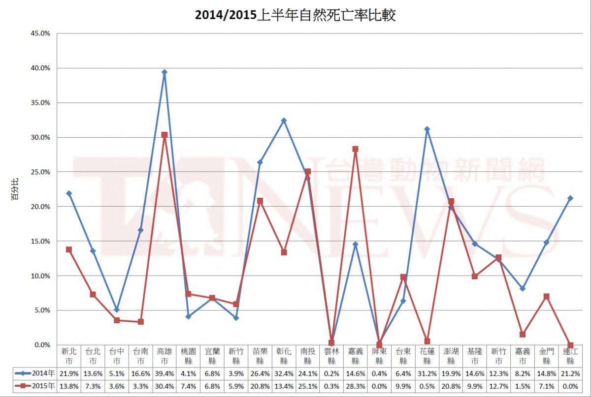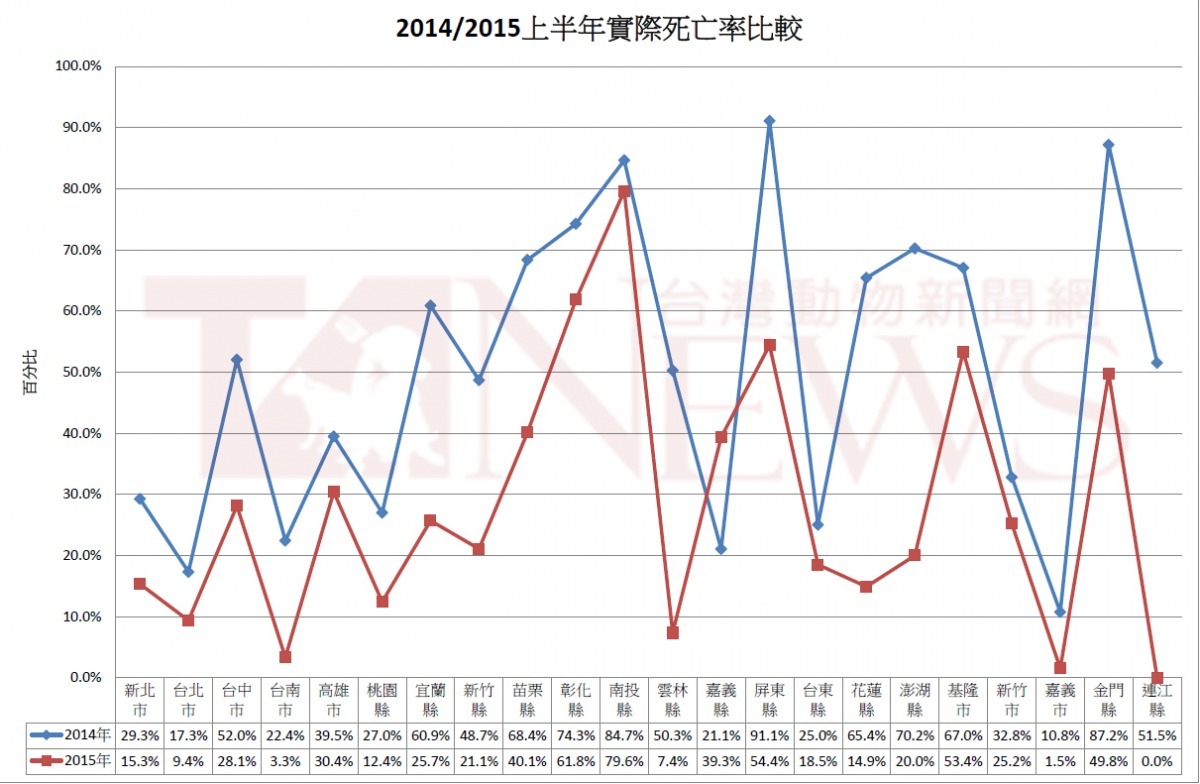 台灣動物新聞網於去年8月份時,同樣統計全台各縣市公立收容所的認養率、人道處理率及自然死亡率做出排名,當時實際死亡率(安樂死+自然死)第一名是高達91%的屏東縣,今年則由80%的南投縣為最高。雖然屏東縣仍是實際死亡率前三名,但值得一提的是上半年屏東縣並無自然死亡,可能代表所內狗隻享有較好環境及福利。