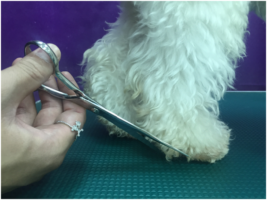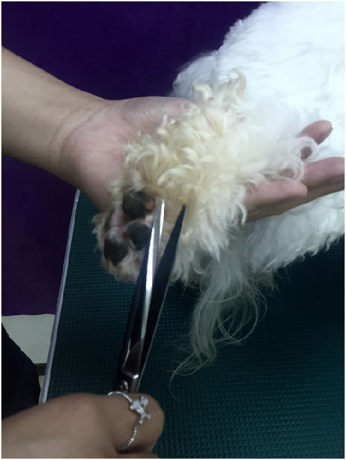 長毛毛孩的腳底周圍毛比較長,還需要使用剪刀進行修剪,將毛孩置於適當高度的桌面上,小心的修剪靠近腳底附近的毛,剪刀的尺寸不需太長約在5吋內的即可,注意抬起毛孩腳的時候只能朝毛孩的身體的正前方或後方,不可以往左右方向轉動,高度也不宜過高,不正確的握姿會使毛寶貝的腳扭傷喔!使用剪刀的時候開口也要注意不要超過20度,必須謹慎注意。