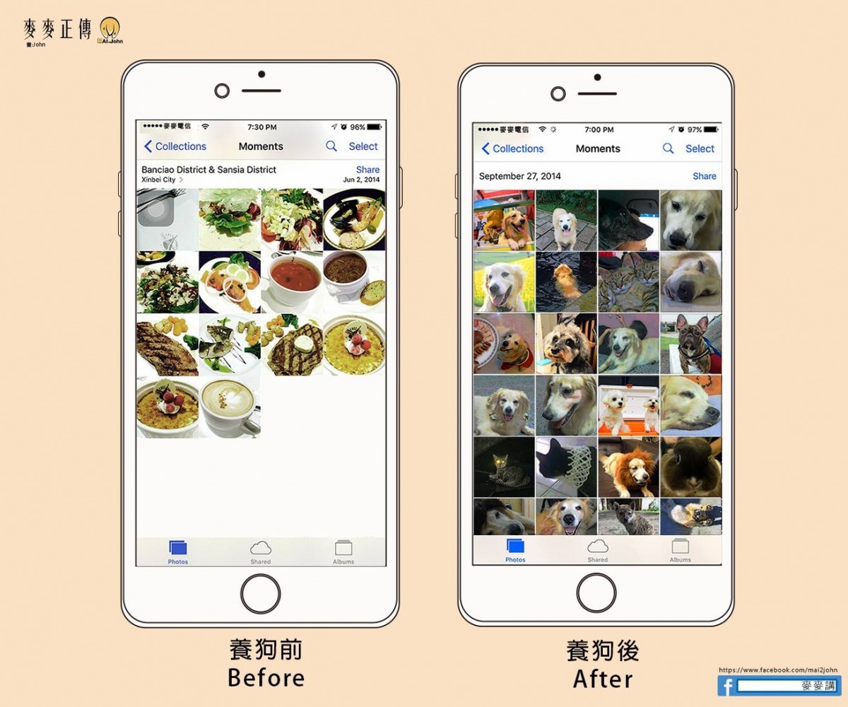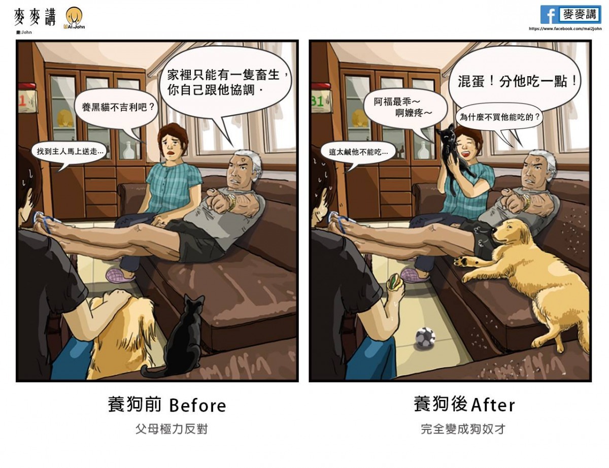 在養狗之前,John家有位注重環境整潔的爸爸,除了人以外的動物禁止入門,但自從第一隻狗、也是「麥麥講」專頁的主角麥麥進家門後,爸爸居然破天荒地讓John與姐姐不斷中途撿到的貓狗,乖巧的麥麥擊破了John爸爸的成見,可也連帶拯救了無數其他貓狗呢!