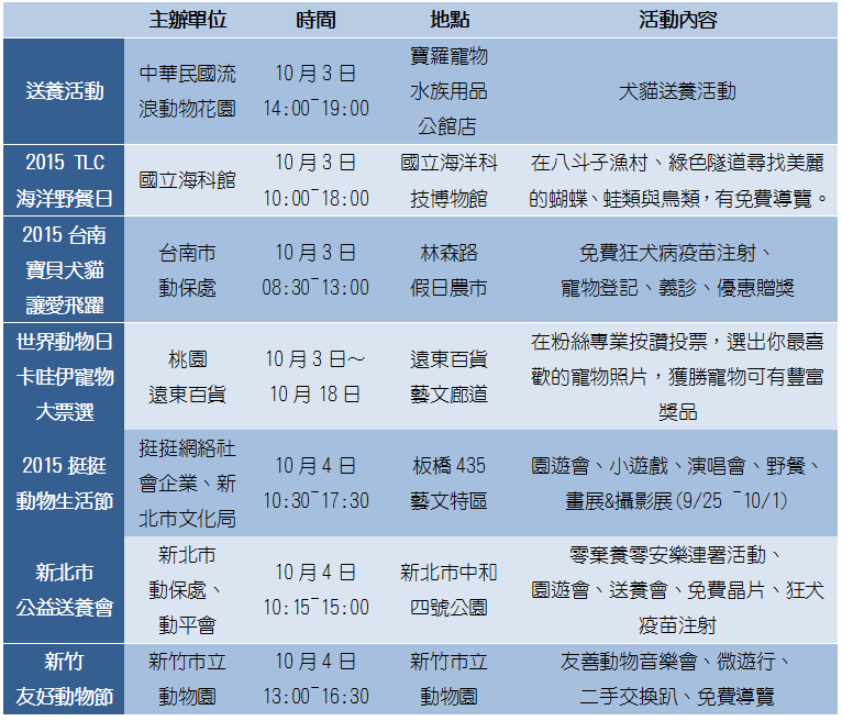 本周日是「世界動物日」,不過今天起就有許多慶祝活動了(詳見附表),讓寵物飼主和愛護動物人士可以就近去選擇參加!