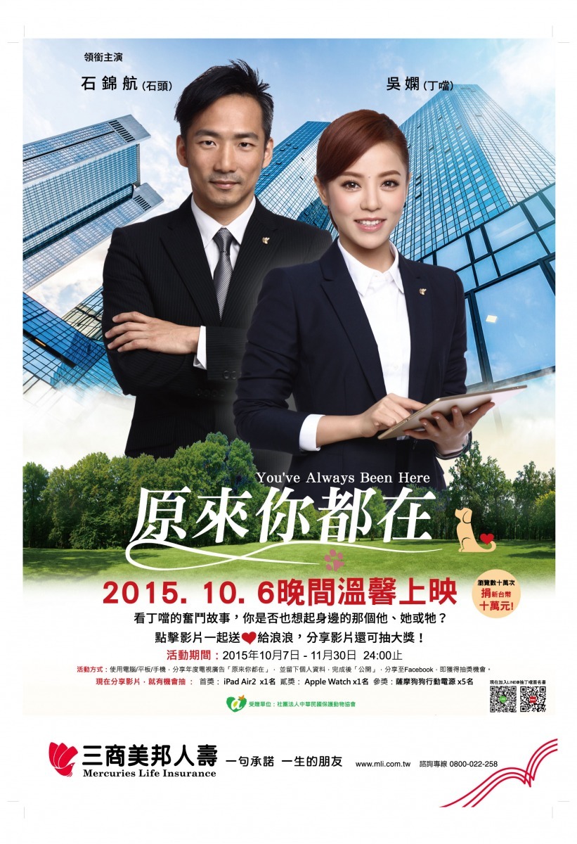 你最近曾在電視上留意過一個廣告,是藝人丁噹穿著套裝四處奔波的畫面嗎?這支由三商美邦策劃的「原來你都在」廣告,不僅有最近火紅的五月天成員「石頭」,更多了新面孔「丁噹」,而5分鐘的完整版還有超搶戲的浪浪們同台尬演技哩! 日前上網播映設定只要點擊達10萬人,三商美邦便會捐款給中華民國保護動物協會,沒想到在短短一天內就達標啦!