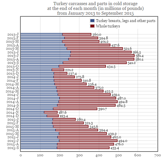 而在「Counting Animals」網站上可看到計算美國人食用火雞的數量,光是一個感恩節就能吃掉3700萬隻火雞,全年的食用量更高達2億3660萬隻,和美國3億1890萬的人口量相去不遠。不過,如果和前幾年相比,美國食用火雞的數量是逐年下降的。