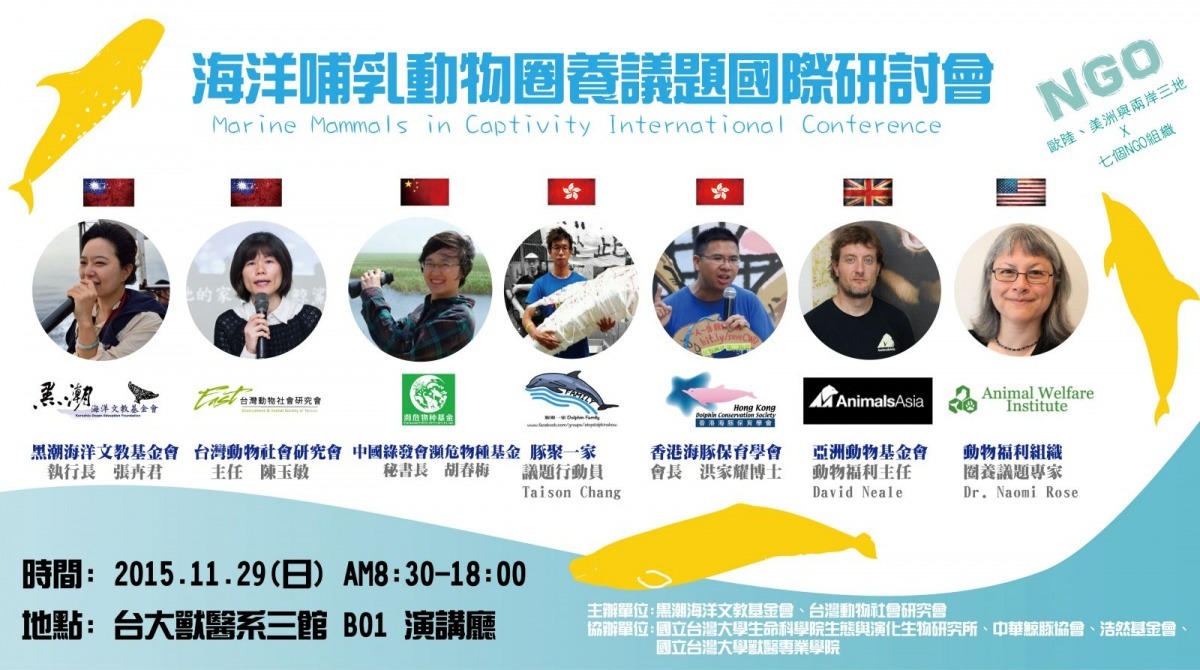 「海洋哺乳動物圈養議題國際研討會」由黑潮海洋文教基金會、台灣動物社會研究會主辦,於11月29日(日)早上8:30至下午18:00舉行,關懷範圍擴及兩岸三地,特別將「中國展演動物現況與倡議行動」列入講題,邀請中國與香港的專家前來主講。
