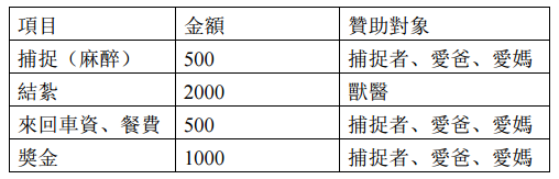 2000元是給負責手術的動物醫院,500元是吹箭麻醉費用、500元是餐費和車資,而剩下的1000元是給愛爸愛媽等捕捉者的獎金。
