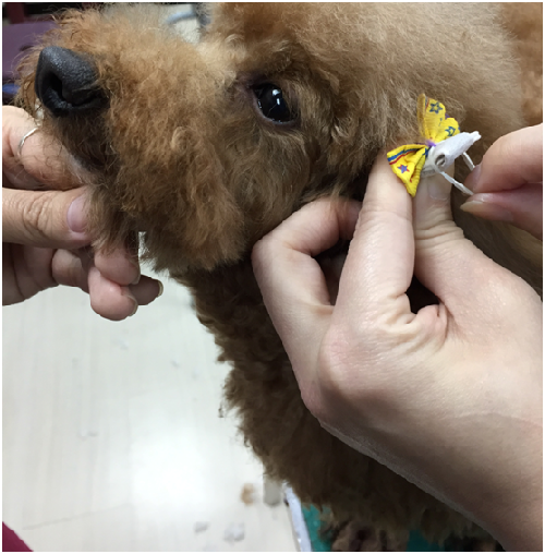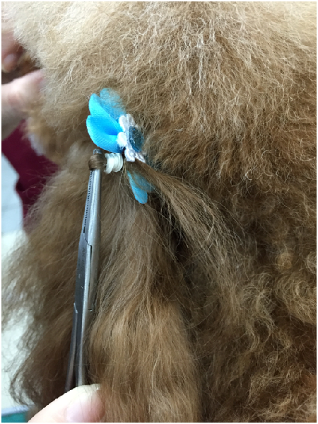 - 使用止血鉗綁法。在開始前先將毛小孩的毛髮梳理整齊,再配上喜愛的蝴蝶結。蝴蝶結的取得很容易,在許多寵物美容院都能挑選到喜愛的款式,將蝴蝶結上的橡皮筋纏繞止血鉗前端3圈,然後在毛小孩的耳朵兩側或是頭頂部位取少量毛髮,用止血鉗夾住毛髮後,小心地將橡皮筋纏繞於上,蝴蝶結便能巧妙地附著在毛髮上啦!
