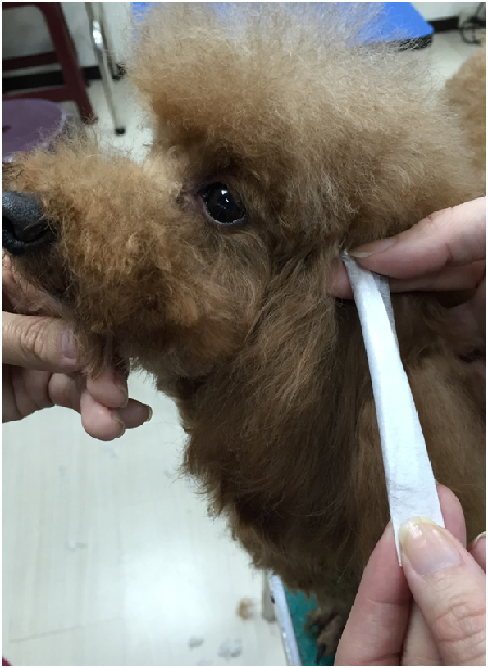 - 使用美容包毛紙綁法。簡易的美容紙可以從美髮材料行購買,材質和美髮院 所使用的冷燙紙相似,而寵物專用的美容紙較厚、長、寬,適合使用在毛束量多,且長度超過15公分以上的毛髮使用。美容紙綁法可以取較多毛束,然後將毛髮折入其中,對折之後摺成一公分大小,再將蝴蝶結纏繞在美容紙上。