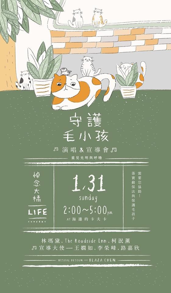 為了從源頭解決問題,兩位自大橘子案發生起便持續關心的一般民眾組成「貓膩公會」,共同策畫了「守護毛小孩演唱&宣導會」,活動不與商業結合,表演者與宣導者也都無償付出,只是希望能讓社會大眾持續關心事件,並以實際行動來宣導正確觀念,期望能幫助所有受到傷害的心靈堅強起來,不只為了大橘子,也為全台各地正在發生的虐待動物案件發聲。
