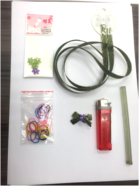 最小號橡皮筋;緞帶和亮片裝飾<在文具行就可以買到>;打火機和熱溶膠。