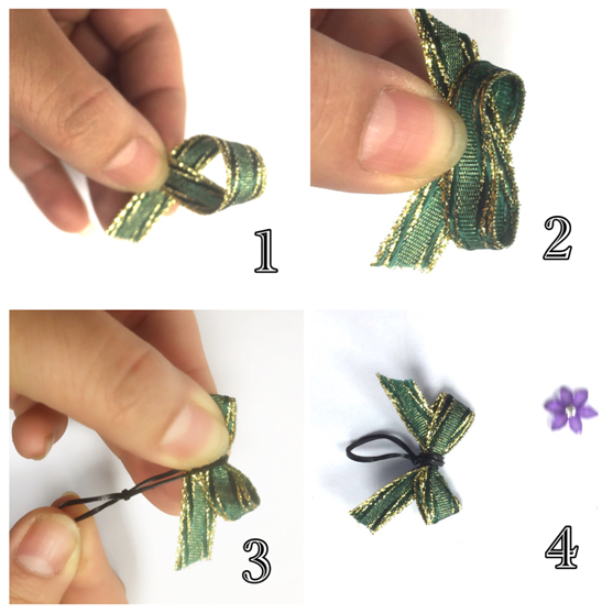 開始動手製作囉~ 首先先把緞帶剪成10公分長度,(1)用總長1/3摺成一個㘣弧之後(2)在把較長的緞帶對折拉出大小等邊的蝴蝶結形狀,先用手指按住中心點(3)將兩個小的橡皮筋套在一起,其中一個橡皮筋套住蝴蝶結的中心點纏繞2圈,這時記得要稍微用力壓緊蝴蝶結,才不會在纏繞的時候造成蝴蝶結中心點偏移變成不對稱(4)蝴蝶結基本完成!裝飾亮片擺在一旁備用。