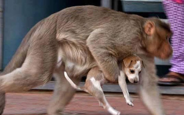猴媽媽總是把狗兒子擁在懷裡,一如母猴對待小猴一般,也會替狗兒子理毛抓蝨子,形成有趣景象。新德里民眾在驚異猴子和狗之間能建立這樣強烈的情感之餘,也都很樂於供應牠們食物,這才發現,猴媽媽總是讓小狗先吃,小狗吃剩的,才由牠食用。