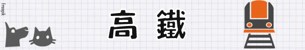 高鐵車站及列車原則上不得攜帶動物進入,但只要飼主將寵物(犬、貓、龜、兔、魚蝦類)裝於長、寬、高尺寸小於55公分、45公分、38公分之容器內,無糞便、液體漏出之虞即可。乘車期間旅客除不得將動物放出容器外,並需置放於本身座位前方自行照料。(執行任務之警犬、導盲犬或由專業人員陪同之導盲幼犬不在此限)