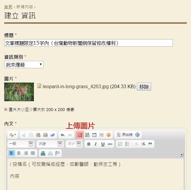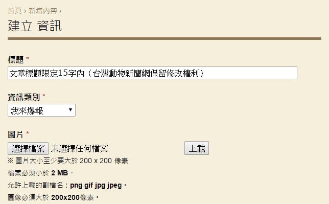 投稿文章標題請訂在15字以內,台灣動物新聞網將保留修改權利(若修改,會於內文註明原標題),資訊類別選擇「我來爆報」,圖片選項為這篇投稿顯示在網站上的縮圖,轉貼至臉書的縮圖也是此圖,選擇檔案後點選上載,若有出現小圖就表示完成步驟