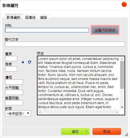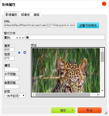 上傳成功後,可以在替代文字中加入圖說與照片攝影者、來源(請使用公開版權或取得攝影者授權之照片),照片若為橫向,寬度固定為600,直向則是高度固定為600。設定完成後,點選確定即完成插入圖片