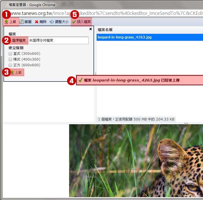 再跳出此視窗後,點選1上載會出現左上角小框,接著2選擇檔案、3上載後,若是有出現4「檔案已被上傳」通知(同時下方有圖片顯示),就可以點5插入檔案,回到上一個視窗。