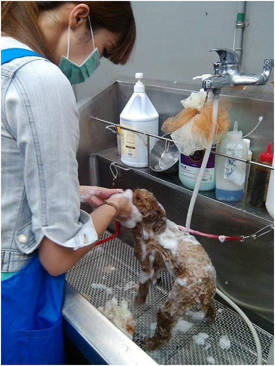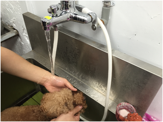 2.準備好稀釋過的洗劑,洗澡的順序先從身體四肢開始,最後才是清洗頭臉部,防止泡沫造成刺激或誤食,不要使用蓮蓬頭沖洗頭部,應該是在水龍頭下開啟較小流量的水,雙手穩定的輕輕握住毛小孩的頭,水不直接沖洗到毛孩臉部,而是讓水順著手掌背部經過手指頭緩慢輕柔地揉搓臉周清洗,務必要避免水從鼻孔內進入。