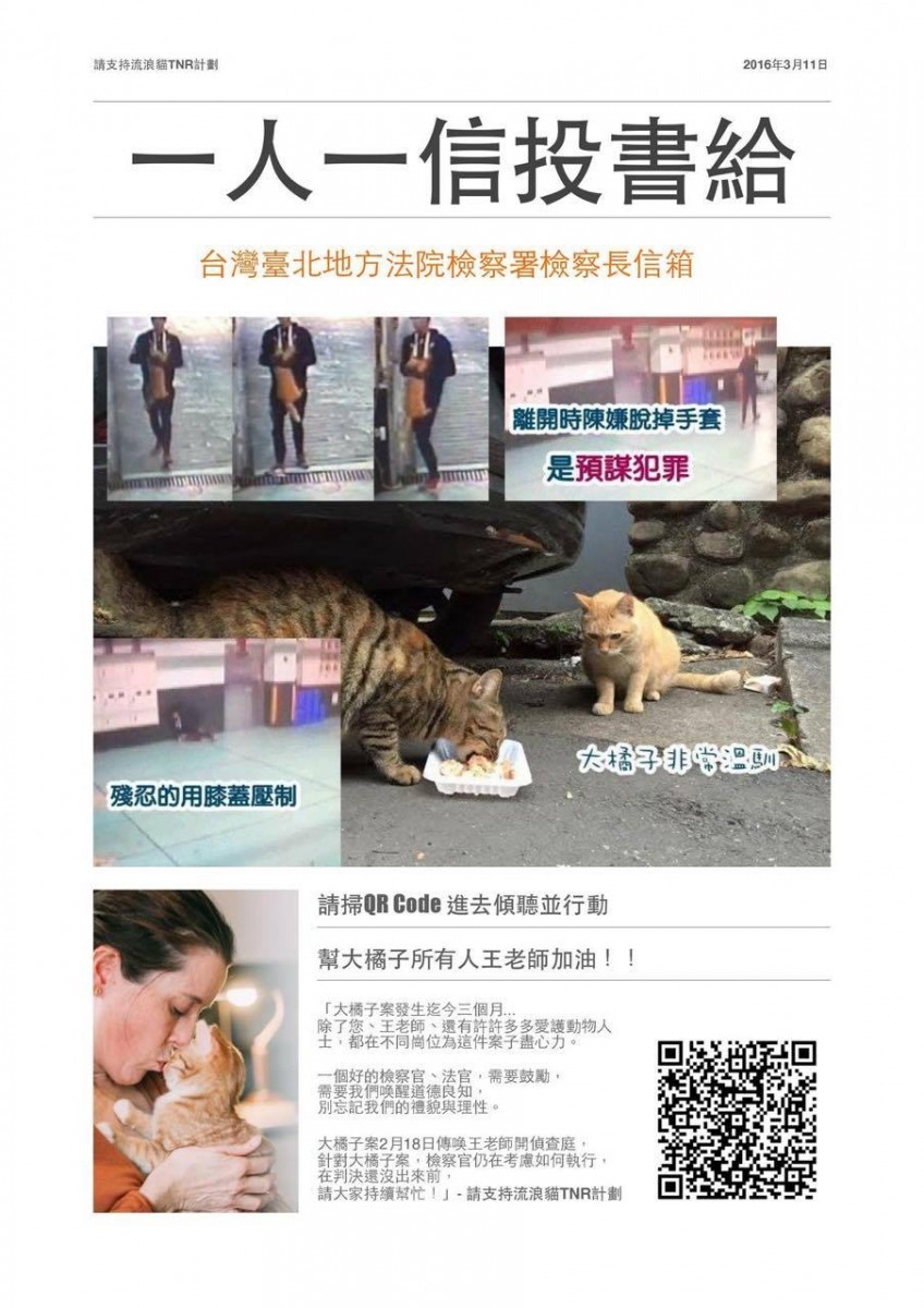 去(2015)年12月28日,台北市溫州街的親人貓咪「大橘子」被虐死,案發至今2個多月,仍有不少人關心案情進度,日前傳出承辦檢察官有意讓案件往和解方向進行的消息,於是有民眾在今(11)日於台北地檢署前舉辦「聲援大橘子事件,盡速起訴不和解」請願活動,向司法單位表達「動物虐殺零容忍,盡速開庭不和解」訴求。