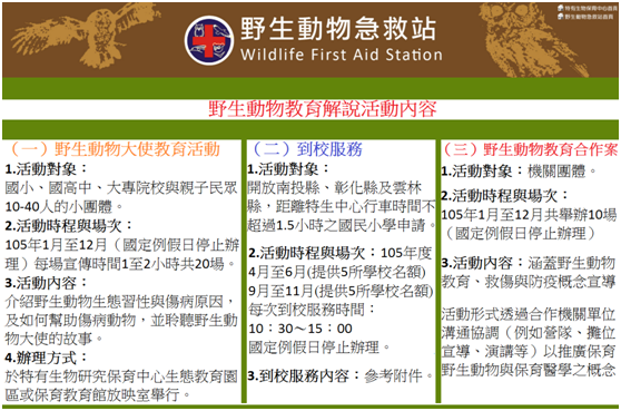 由「特有生物保育中心」成立的「野生動物急救站」平常忙於救治從台灣各地送來的受傷野生動物,也為了把愛護動物的觀念推廣出去,再忙,也會配合教育推廣,接受學校、機關、團體預約解說教育,還運用失去野外生存能力無法野放的動物,擔任野生動物大使,帶至學校與學生或民眾近距離接觸,讓更多人了解牠們可貴的生命在台灣所受遭遇。