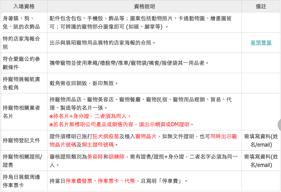 而針對即將開展的寵物展,主辦單位也祭出「免費入場-愛寵你我牠」的活動,只要符合上圖的入場資格者,即可獲得當日免費入場一次、限一人使用!(詳細活動規定點此)