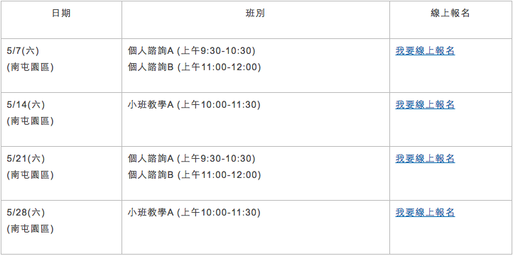 2. 諮詢講座共分為1對1及小班教學2種諮詢形式,請先於報名網頁確認時間及班別後再行報名。