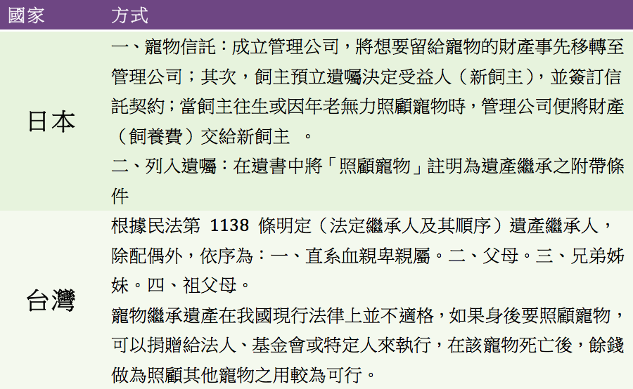 律師艾倫(Margo Allen)說,許多人已經把寵物當作家人,所以有越來越多人會確保自己過世後,有一位信得過的人能代為照顧寵物、並且還留下一筆照顧用的經費。他強調,一定要找專業的律師幫忙準備相關的資料,包含確認委託人同意照顧的相關內容,就算委託人屆時不遵守,也可以要求至少要把狗狗送到沒有安樂死的收容所。而大多數的飼主會留下約5000~10000美元(約新台幣16~32萬)的錢,確保足以負擔狗狗往後需要的醫療費用。