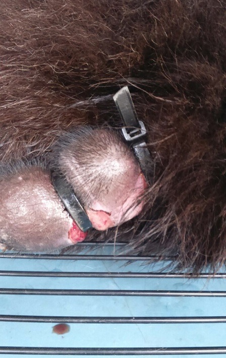 又是在元朗,一隻黑色唐狗尾部被3條粗索帶緊緊绑著至陷入皮肉內,嚴重受傷至見到尾骨,絕對相信是人為造成。警方列為懷疑虐待動物案處理。