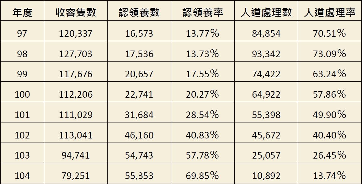 在頒布實施《動物保護法》的前幾年,全國動物收容所每年捕捉收容的動物估計最少超過12萬頭以上,而安樂死數量則接近10萬頭左右。