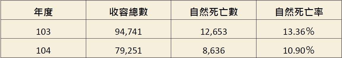 然而,有一個問題值得檢討,那就是在收容所內「自然死亡」的問題。所謂的「自然死亡」包括了:老死、病死,總之不經過人類加工的死亡(可以減少人道處理率),就被稱作「自然死亡」。在美國的動物收容所,自然死亡率只要高於2.5%,就會被評比為「低動物福祉」的動物收容所。而,從表二顯示,全台灣公立動物收容所得自然死亡率平均高達10%以上,表示收容所內的動物福祉指標極差。